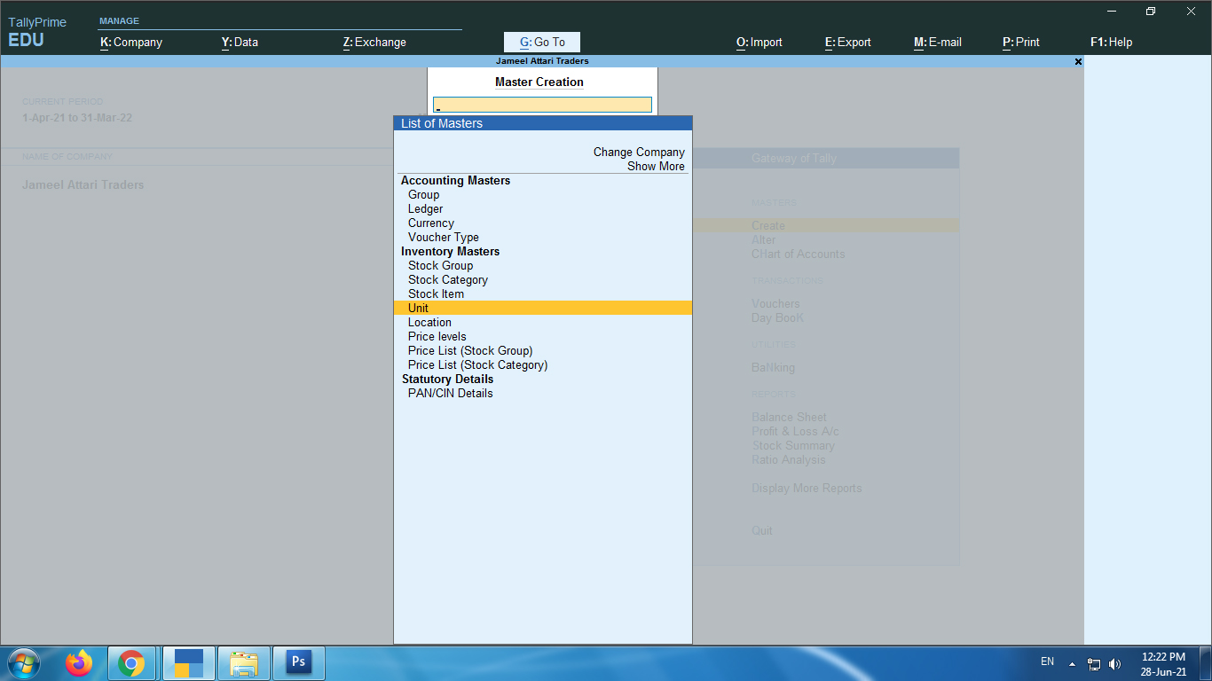 • अब हम आ जाएंगे Master Creation पर  यहां हमें Unit पर Enter करना है|